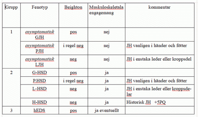 HSD men även hEDS ingår i det stora hypermobilitetsspektrumet tillsammans med hypermobilitet utan symptom i andra änden. Hela spektrumet beskriver i princip 3 grupper enligt följande :